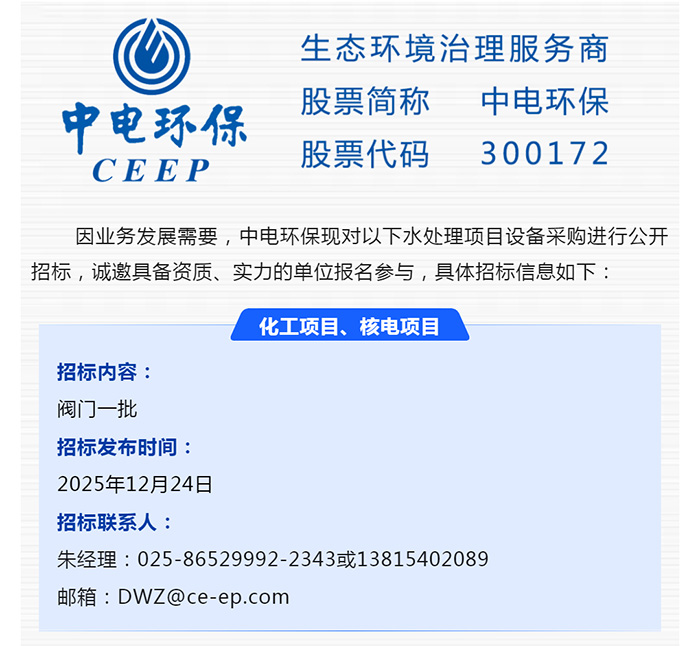 中電環(huán)保股份有限公司是南京市首家環(huán)保上市公司(股票簡(jiǎn)稱(chēng):中電環(huán)保,股票代碼:300172),南京環(huán)保產(chǎn)業(yè)協(xié)會(huì )會(huì )長(cháng)單位,國家級聯(lián)盟理事長(cháng)單位,是生態(tài)環(huán)境治理服務(wù)商,主營(yíng)(3+1):水務(wù)、固危廢、煙氣治理及產(chǎn)業(yè)創(chuàng )新平臺,包括:工業(yè)水處理、污水處理及水環(huán)境綜合治理;固危廢土壤、污泥餐廚垃圾處理;煙氣及VOCS治理;智慧環(huán)保;高端裝備等。